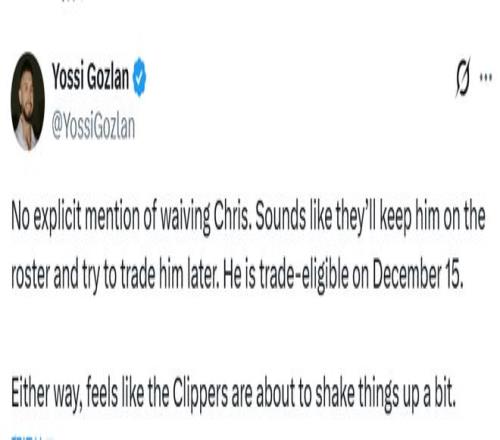薪金專家戈茲蘭指出,快船在官宣這一勁爆消息的聲明中,並未提及“裁掉保羅”的相關表述。“聲明裏沒明確說要裁克裏斯,聽著像是他們會先把他留在陣容名單裏,之後再嚐試交易。他12月16日就能被交易了。不管怎樣,快船這是要開始搞點大變動了。”