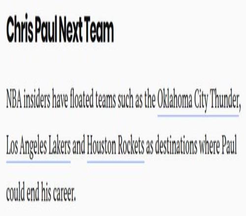 NBA圈內人士已列出多支可能成為保羅生涯終點站的球隊,包括俄克拉荷馬城雷霆、洛杉磯湖人和休斯頓火箭。