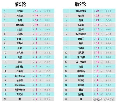 不妨先看看這個積分榜,一個是英超前5輪的,一個是英超後9輪的(曼聯和西漢姆未賽),大家能不能發現一些有趣的事情呢?