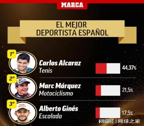北京時間昨晚,有外媒報道,稱男單世界第一阿爾卡拉斯當選由《馬卡報》評選的西班牙年度最佳運動員。在這項評選活動中,阿卡的得票率為44.37%,大幅領先身後的兩位競爭者。祝賀他!