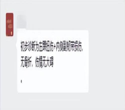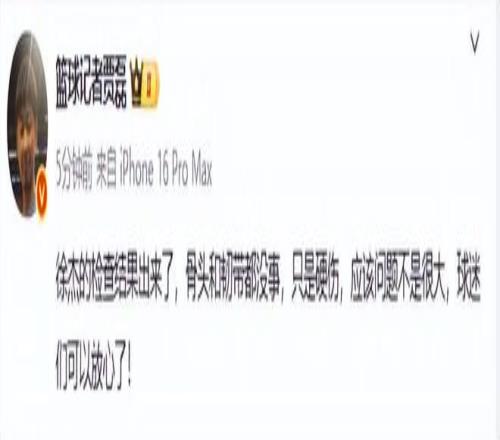 據了解,徐傑受傷後第一時間被送到醫院檢查。據籃球記者賈磊報道,徐傑的檢查結果出來了,骨頭和韌帶都沒事,隻是硬傷,應該問題不是很大,球迷們可以放心了!也可以這樣說,徐傑就是左腳踝嚴重扭傷。另據球迷群透露,徐傑左踝扭傷+內側副韌帶損傷,無骨折,傷情無大礙。不過徐傑肯定一時打不了比賽,從現場受傷情況來看,他起碼要休息半個月以上。