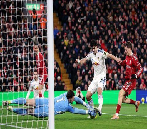 2天後要奔赴倫敦連戰富勒姆和阿森納,麵對客場防守稀鬆的利茲聯(此前客場比賽全部有丟球),斯洛特繼續將小傷在身的維爾茨放在了前場偏左的位置,畢竟上輪對壘狼隊,德國人就在這個角色上幹得不錯。開場階段,維爾茨和埃基蒂克的呼應也的確不少,法國前鋒首次射正被盧卡斯·佩裏撲出後,第二次內切選擇找到小禁區邊緣的維爾茨,但後者跟進推射被封堵。眼見客隊三中衛守得腹地密不透風,利物浦由瓊斯等人逐漸增加外圍發炮,孰料本方禁區卻險些被偷襲得手。阿利鬆幾乎沒有難度的出球直接送到安帕杜腳下,好在後者也沒做足射門準備,掄了一腳也是回傳力度。