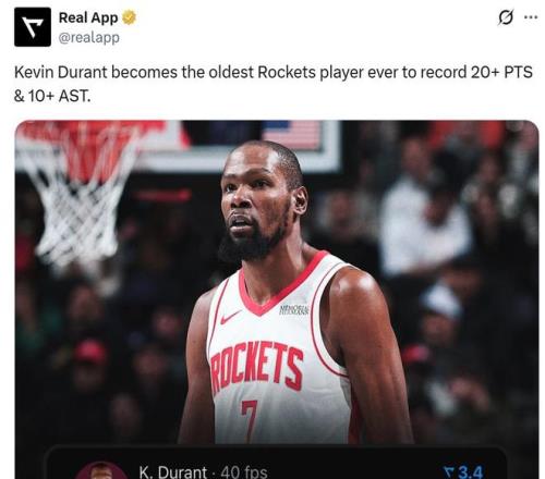 憑借這樣的表現,37歲95天的杜蘭特超越德雷克斯勒成為火箭隊史單場至少拿下20分10助最年長的球員。