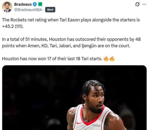 在伊森進入首發的18場比賽中,火箭隊拿下17勝1負傲人戰績,當他與杜蘭特、阿門、賈巴裏、申京一起出戰時,火箭隊淨效率達到誇張的+45.2,一共51分鍾時間裏麵贏了對手48分。