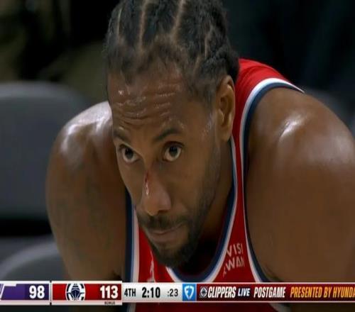 然後倫納德就暴走了,連續命中三分,連續助攻隊友命中三分,單節狂砍20分,全場拿下45分,這已經是他拿到55分之前的生涯最高分。最後時刻的一個鏡頭,倫納德臉上都出血了,表情仍是麵沉似水,活脫脫一個冷血“殺手”。