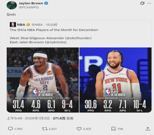 NBA官方公布12月份的月最佳球員,布倫森當選東部月最佳,亞曆山大當選西部月最佳。凱爾特人球員傑倫-布朗轉發這則報道,並表示不理解。此後布朗在直播中還說道:“無意冒犯亞曆山大和布倫森,但他倆這月的表現都不如我。”