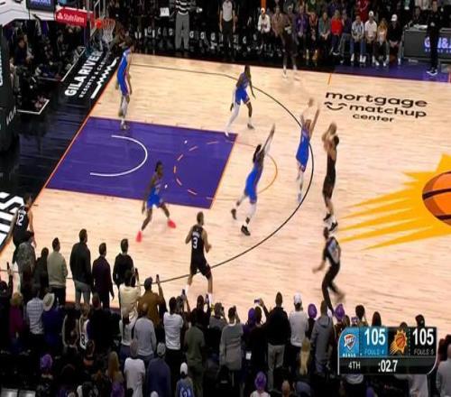 太陽此時場上五個人都有投三分的能力,雷霆沒有輕易選擇包夾,多爾特在布克的突破路線上等待。布克觀察了一下局勢,佯裝左側突破,隨後撤步三分出手,在多爾特和卡魯索這對讓聯盟聞風喪膽的防守組合麵前,投進絕殺三分!