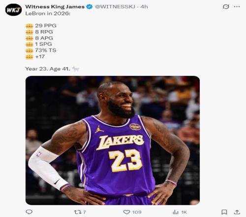 進入2026年後,詹姆斯兩場比賽場均29分8籃板8助攻1搶斷,真實命中率73%,正負值+17,這四項數據出爐後湖人媒體再度盛讚勒布朗就是GOAT。