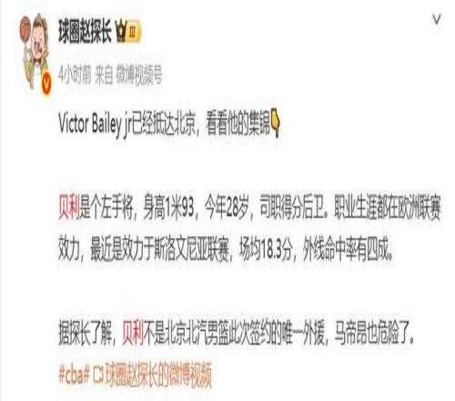許指導沒有說太多,但北京男籃接下來的新外援是誰,賽前已經有不少球迷們都知道了,據媒體人趙探長的爆料,北京近期已經簽下了小外援維克托·貝利,貝利身高193cm,上賽季效力於德甲聯賽開姆尼茨隊,場均得到15.2分2.6籃板1.9助攻,本賽季效力斯洛文尼亞聯賽效力,場均能得到18.3分,三分命中率有4成,並且貝利也不是北京隊的唯一新援。