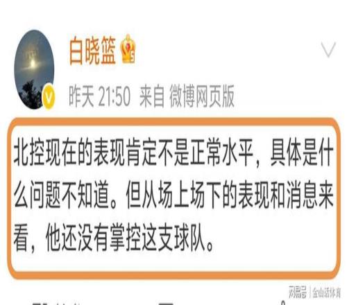 北控男籃士氣低落,也讓許多媒體人覺察到。賽後,媒體人白曉籃社媒發文點評本場比賽。配文:北控現在的表現肯定不是正常水平,具體是什麽問題不知道。但從場上場下的表現和消息來看,他還沒有掌控這支球隊。