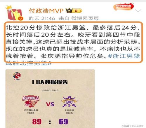 著名媒體人付政浩更是直言不諱,他在個人社交平台寫道:北控20分慘敗給浙江男籃,最多落後24分,長時間落後20分左右。咬牙看到第四節中段直接關掉,這球已超出技戰術層麵的分析範疇。現在的球員也真的是坦誠直率,不痛快也從不藏著掖著。張慶鵬指導帥位危矣。