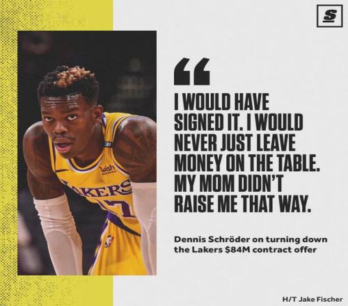2020年12月,施羅德拒絕湖人2年3340萬美元的續約合同。2021年3月,多家媒體報道,施羅德拒絕湖人開出的4年8000萬美元續約合同。2021年休賽期,施羅德1年590萬美元加盟凱爾特人,他拒絕大合同的事情也被拿出來群嘲。