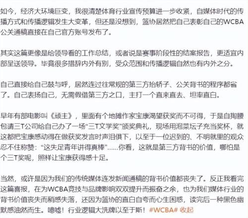 知名籃球媒體人付政浩表示:“這種明顯帶有自誇性質的公關稿件不應是由第三方來發布才更有背書效果和公信力嗎?現在都習慣直接‘王婆賣瓜自賣自誇’嗎?”