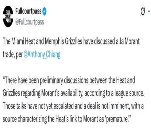 北京時間1月15日,據熱火隊記Anthony Chiang報道,熱火與灰熊之間已就莫蘭特的交易可能性進行了初步談判。不過這些談判尚未升級,交易也並非迫在眉睫,有消息人士稱熱火與莫蘭特的關聯還“為時過早”。