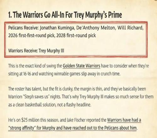金州勇士,是和墨菲聯係最密切的球隊之一,雙方曾多次出現在各種交易流言當中。在美媒《Fadeaway World》最新的報道中,勇士可能會推動一筆5換1的交易方案——送出庫明加、梅爾頓、理查德以及2個首輪簽,引入這位明星前鋒。