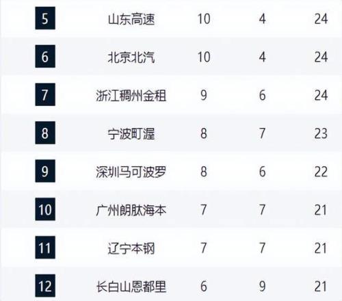 黑馬青島隊以80-67輕鬆擊敗吉林隊,收獲3連勝,戰績來到11勝4負,成功重返積分榜前4,展現複蘇勢頭。山東隊則是主場以大比分戰勝另一匹黑馬寧波隊,戰績變成10勝5負,升至積分榜第5位;北京隊10勝4負緊隨其後,排名第六。浙江隊9勝6負排第七,寧波隊8勝7負跌至第八,深圳隊8勝6負位列第九。