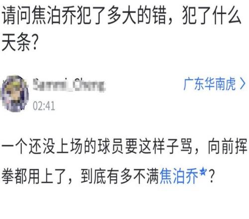 這就有點離譜了,明明是王少傑、杜潤旺防守出現了大空位漏人,杜鋒前腳罵完王少傑,後腳又對前7分鍾比賽一秒沒打的焦泊喬一頓臭罵,十分不可理喻,有球迷在賽後發帖替焦泊喬伸冤:一個還沒上場的球員都要這樣子罵,向前揮拳都用上了,到底有多不滿焦泊喬?焦泊喬是犯了什麽天條?