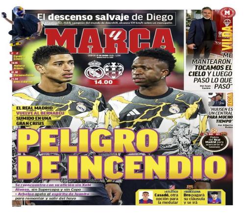 北京時間1月17日21:00,西甲聯賽第20輪,在經曆了錯失西班牙超級杯冠軍、西班牙國王杯以及主教練哈維-阿隆索下課後,皇馬將重返伯納烏球場迎戰萊萬特。早些時候,《馬卡報》發布今日頭版封麵,貝林厄姆、維尼修斯出鏡,標題為:伯納烏球場的“火災隱患”。