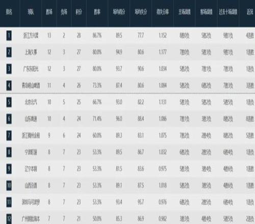 本賽季至今,折兵損將的遼寧隊僅取得8勝7負排名聯盟第九,前四位置分別是衛冕冠軍廣廈隊13-2、上海隊12-3、廣東隊12-3和青島隊11-4。