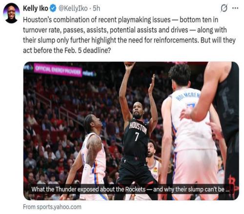 針對這樣的局麵,在距離賽季中期交易截止日越來越近之際,《雅虎體育》火箭跟隊記者Kelly Iko發布長文披露火箭隊內部想法與交易計劃。