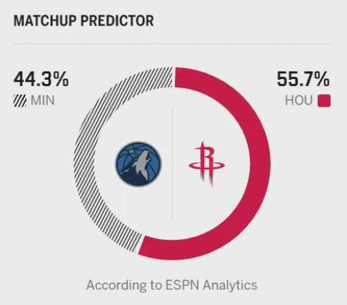 兩隊都是聯盟攻防一體的球隊,火箭防守效率第4、進攻效率第3,森林狼進攻效率第8、防守效率第6。不過,森林狼的整體投籃和三分命中率更占優勢,且擅長攻守轉換,內線得分、二次進攻等數據表現亮眼,極其考驗著火箭的防守整體性;而火箭近期進攻低迷,上一場不敵雷霆創賽季得分新低,連續多場三分命中率低於30%,進攻端的複蘇是取勝關鍵。此外,兩隊均缺乏首發級控衛,森林狼的康利年邁、迪林厄姆尚嫩,火箭則依靠申京擔任組織中鋒,這也為比賽增添了不確定性。ESPN賽前預測火箭今天取得的概率為55.7%,森林狼取得的概率則是44.3%。