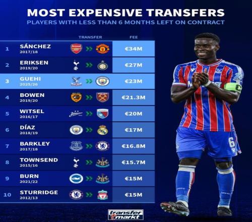 北京時間1月20日,在曼城官宣了格伊的交易之後,德轉列出了世界足壇曆史合同剩餘不到半年的球員轉會身價榜,2018年1月從阿森納轉投曼聯的桑切斯是3400萬歐元排名第一,格伊則以2300萬歐元位列第三。