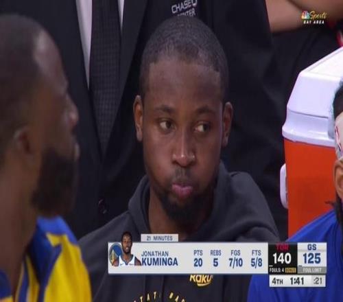 在上場比賽中,巴特勒因右膝前交叉韌帶撕裂而賽季報銷,人手短缺的勇士隊在本場比賽啟用了此前已被DNP16場比賽的前鋒庫明加。全場比賽,庫明加出場21分07秒,10投7中高效得到20分5籃板2助攻1搶斷,三分球3中1,罰球8中5,出現了2次失誤和1次犯規,正負值為+3。