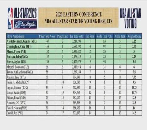 特別是在最近結束的全明星投票環節,雖然在球迷投票環節他的票數247萬僅位列東部第5,但在球員互投環節他獲得138張選票,在東部所有球員中排名第3,僅低於坎寧安的159票和字母哥的147票,而在更有含金量的籃球記者、評論員投票環節,布朗獲得98張首輪票,在東部球員中高居第1,最終綜合評分3.5分,職業生涯首次入選全明星首發,他的擔當表現收獲了一致認可.
