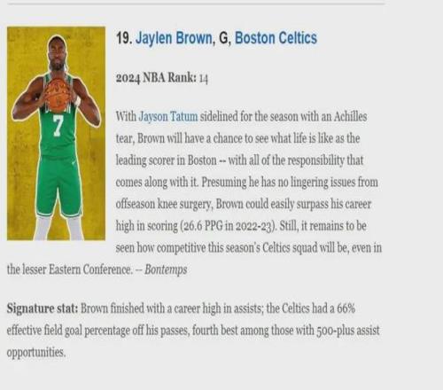 傑倫-布朗一直受到一定程度的低估,他在超頂薪續約時、獲得總決賽MVP時都有許多反對質疑聲音,而且凱爾特人管理層也確實曾認真考慮過關於傑倫-布朗的交易方案,在賽季初ESPM評選的2025-26NBA百大球星中,布朗僅位列第19位,網站評語如下:由於塔圖姆跟腱撕裂賽季報銷,布朗將體驗波士頓凱爾特人隊頭號得分手的生活—以及隨之而來的所有責任,假設他沒有受到休賽期膝蓋手術的後續影響,那他很有可能超越職業生涯最高的場均得分(2022-23賽季26.6分),不過即便身處實力相對較弱的東部聯盟,以目前凱爾特人隊的競爭力究竟有何表現仍有待觀察.