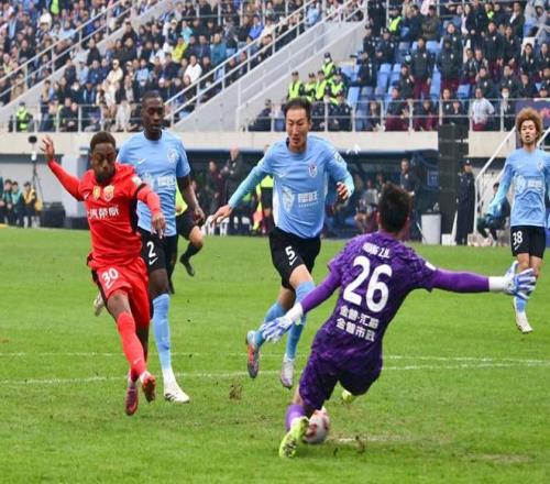 2025年11月22日,上海海港隊球員加布裏埃爾(左一)在比賽中射門得分。 當日,在遼寧大連舉行的2025賽季中國足球協會超級聯賽第30輪比賽中,上海海港隊客場1比0戰勝大連英博海發隊,獲得本賽季中超聯賽冠軍。 新華社發