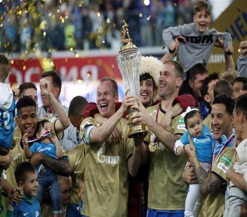 2019年5月5月12日,聖彼得堡澤尼特隊球員慶祝奪冠。 當日,在2018-2019賽季俄羅斯足球超級聯賽第28輪的比賽中,聖彼得堡澤尼特隊主場以3比1戰勝莫斯科中央陸軍隊,隨後舉行儀式慶祝提前奪得本賽季俄超聯賽冠軍。 新華社/歐新