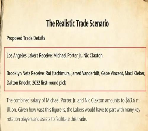 美媒《Fadeaway World》撰文建議,湖人可以將八村壘、範德比爾特、文森特、克萊伯、克內克特以及2032年的首輪簽送到籃網,換回前鋒小波特和內線克拉克斯頓。