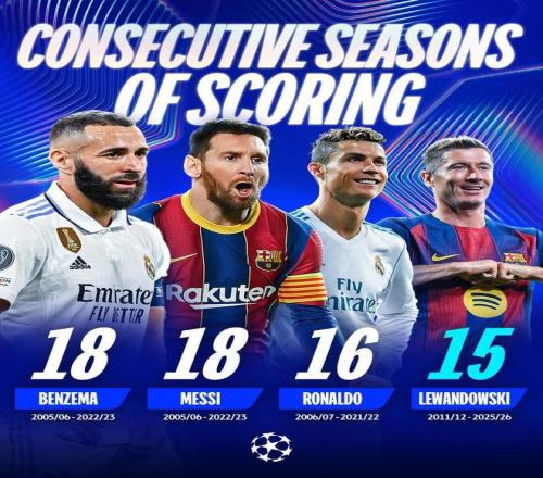 歐冠曆史上,隻有本澤馬(18個賽季)、梅西(18個賽季)和C羅(16個賽季)連續進球賽季比萊萬更多。