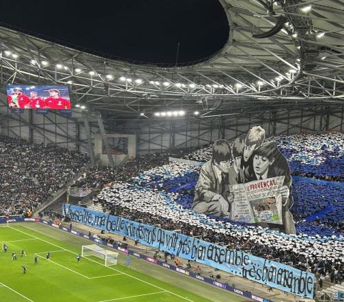 本場比賽在馬賽主場韋洛德羅姆球場進行,賽前,球場看台打出了一幅巨型TIFO,TIFO上畫的是四名年輕男子圍在一起看報紙,明顯致敬的是披頭士樂隊早期形象。