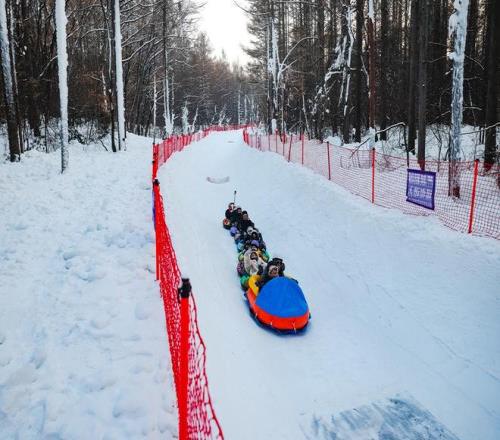 (遊客暢玩淨月潭景區內的森林穿越雪漂流)