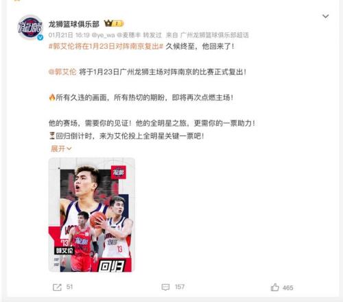 第二個消息分享一下郭艾倫複出時間敲定的情況。大家都知道在前段時間對陣廣東隊的比賽結束之後,郭艾倫因為傷病的問題長時間缺席廣州隊的比賽,到如今已經休息了差不多十場以上的比賽。而如今根據廣州隊官宣的最新消息,郭艾倫已經確定在1月23號對陣南京隊的比賽中將會複出,到時候他也會帶領廣州隊爭取拿下這場比賽的勝利。