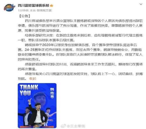 本季17戰全敗!四川男籃官方:韓碩申請辭職尊重意願已同意_24直播網