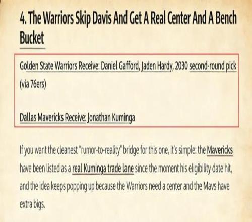 美媒《Fadeaway World》撰文建議,勇士應該將庫明加交易到獨行俠,換回加福德、哈迪以及2030年的次輪簽。