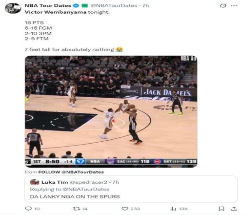 這場比賽馬刺慘敗的罪人就是核心維克托-文班亞馬,他作為一名身高7尺4寸(裸足達到2.24米)的內線,他在麵對奎因、瑪特科維奇、錫安時打不到內線,他更是被胖虎各種頂著上籃,文班亞馬的身體對抗差到極致。