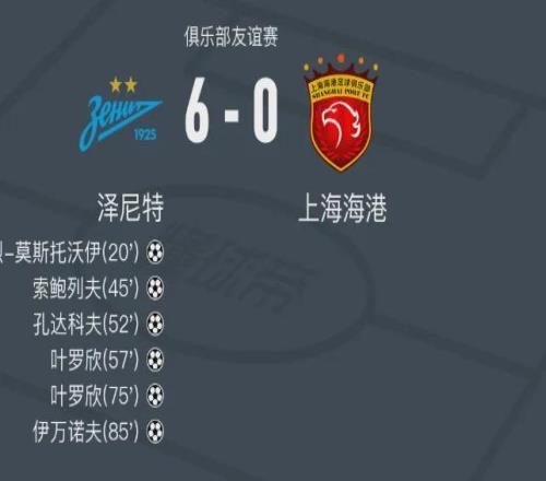 而稍晚時候結束的海港隊與俄超勁旅澤尼特的比賽,海港隊遭遇一場潰敗。