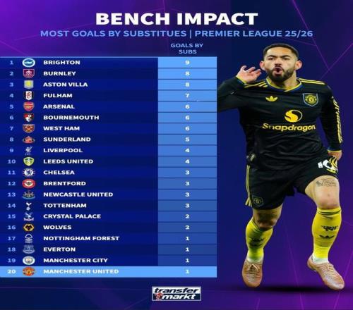 在馬特烏斯-庫尼亞對陣阿森納打入製勝球之前,曼聯是本賽季英超唯一一支替補球員沒有進球的球隊。