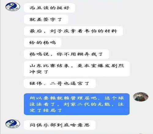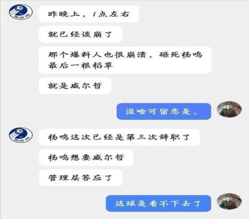 事後球迷評論區,有球迷曬出了一張和“知情人”聊天的截圖,據“知情人”透露,這不是楊鳴第一次選擇辭職,而是第三次,“砸死”楊鳴的最後一根稻草,就是威爾哲,之前楊鳴想要管理層引進威爾哲,管理層答應了,並且雙方就差簽字了,但到了最後,總經理劉子慶卻出爾反爾,拿著韋伯的材料給楊鳴,楊鳴表示:你不用糊弄我了。