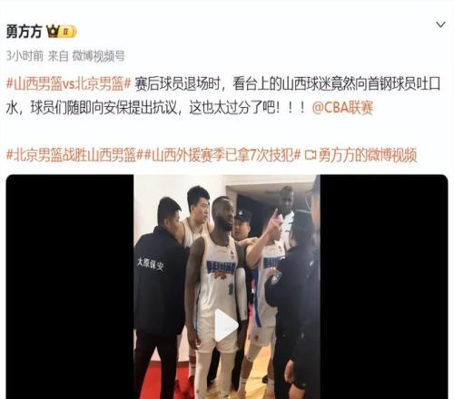 麵對缺少周琦、趙睿、曾凡博、斯佩爾曼多位主力的殘陣北京,擁有天時人和地利,山西卻還是輸給了陣容比他們更加殘缺的北京,吃下3連敗,山西球迷氣急敗壞,再次做出不冷靜舉動,媒體人勇方方爆料,賽後山西看台有人向北京球員吐口水(估計山西又要被CBA追加處罰了)。