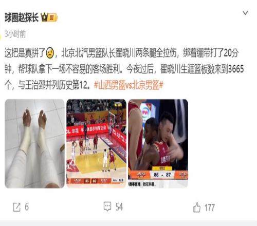 北京贏得不容易,但代價也是慘重的,翟曉川又拉傷了,賽後趙探長曬出了川隊雙腿纏滿繃帶的照片,表示:翟曉川兩條腿全部拉傷,綁著繃帶打了20分鍾。