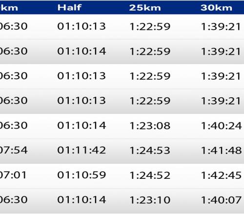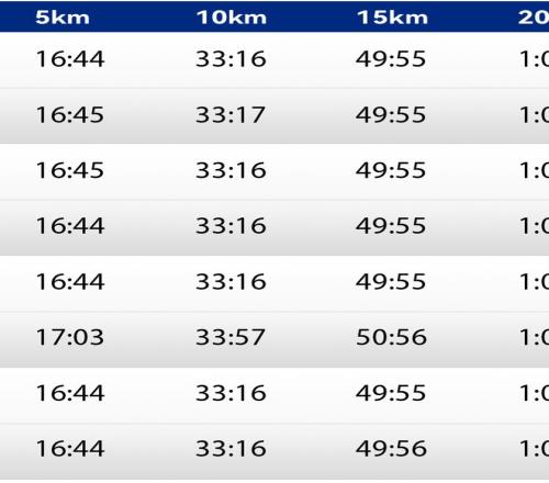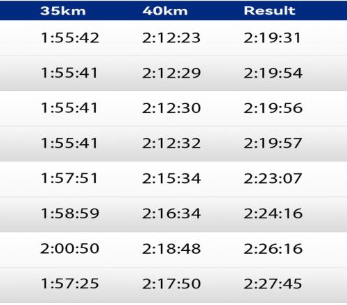 大阪國際女子馬拉鬆的第一集團配速員的配速是每5公裏16分35秒(2:19:56完賽),第二集團的配速員配速是每5公裏16分55秒(2:22:45完賽)。