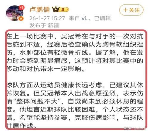 值得一提的是,本場比賽,新疆隊內線悍將吳冠希,帶傷上場表現出色。據媒體人盧鵬儒賽前報道,吳冠希在上場對陣遼寧隊的比賽中受傷,經醫院檢查確認為肋骨骨裂。球隊管理層和教練組,從球員的健康角度考慮,建議他此役休戰,但吳冠希表示球隊目前比較困難,自己感覺“問題不大”,主動請纓上場參賽,這也令全隊上下非常感動。