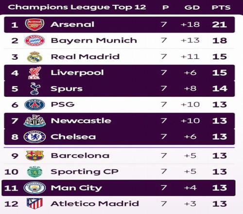 聯賽階段7輪過後,英超5支球隊排名前八,展現出了強勢的狀態。能否創造6支球隊晉級前八的奇跡,需要看曼城能否一鼓作氣,在淨勝球上超越巴薩和葡體,同時紐卡需要擊敗巴黎,切爾西、熱刺、利物浦也都擊敗各自對手。