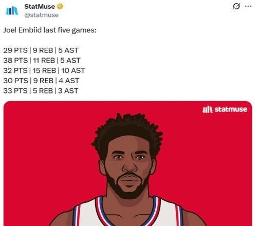 並且恩比德的輸出還呈現出明顯的上升勢頭,過去5場比賽恩比德場均數據提升至32.4分9.8板5.4助華麗數據。