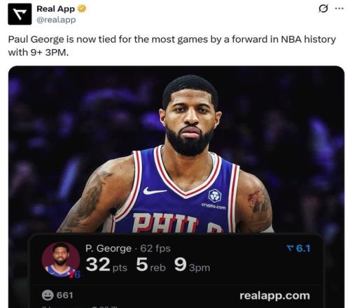 其中喬治21中11,三分15中9,爆砍32分5板5助2搶斷,正負值+13全場第二,第三節單節獨攬16分,幫助76人隊一波流收割勝利輕鬆實現三節打卡。