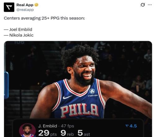 這也是恩比德本賽季重回賽場後表現的縮影,本場比賽後,恩比德場均得分來到25.2分,他與約基奇(29.6)是聯盟本賽季僅有的兩名場均得分超過25分的中鋒。